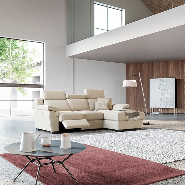 Cet équipement offre une banquette complémentaire disposée à angle droit de l’assise principale. Le dossier s’incline électriquement, le repose-pieds s’allonge à la demande. Si les dimensions de votre salon le permettent, optez pour ce type de modèle grand confort.